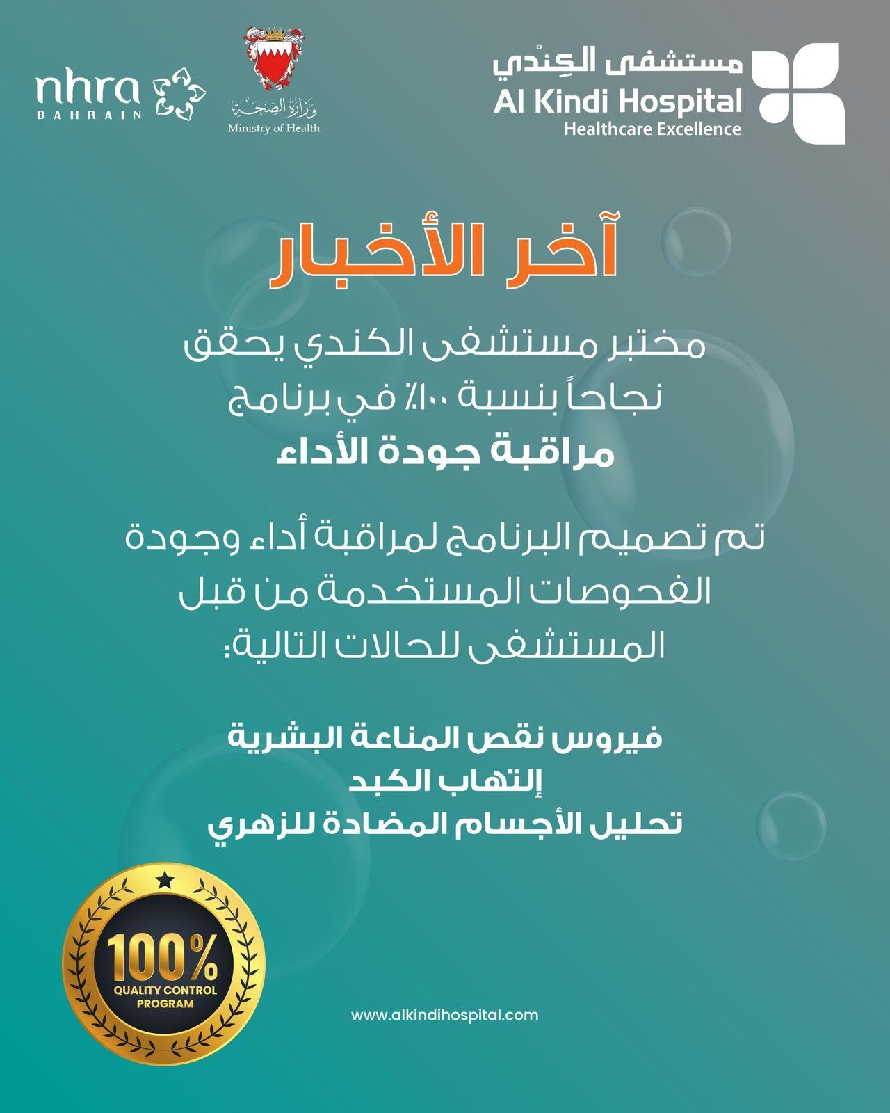 يسعدنا أن نعلن أن مختبر مستشفى الكندي حقق نجاحاً بنسبة 100% في برنامج مراقبة جودة الأداء. ويعكس هذا الانجاز التزامنا بتقديم أعلى معايير الرعاية الصحية لمرضانا. بالإضافة إلى التزامنا بلوائح ومعايير الهيئة الوطنية لتنظيم المهن والخدمات الصحية.